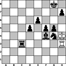 game notation in PGN-format [Event "1.Chess in Friendship"] [Site "www.myChess.de"] [Date "2004.08.10"] [Round "2"] [White "icke"] [Black "Schili"] [ECO "C00"] [WhitemyELO "1272"] [BlackmyELO "1500"] [Result "0-1"] [TimeControl "10/2592000"] [WhiteDays "180"] [BlackDays "168"] [MyChessNo "6095"] 1. e4 e6 2. Nf3 Nc6 3. d4 d5 4. e5 g6 5. Bg5 Be7 6. Nc3 Bxg5 7. h4 Bh6 8. Nb5 a6 9. a4 axb5 10. Bxb5 Nge7 11. Ra3 O-O 12. O-O Bd7 13. Rb3 Nf5 14. h5 Na5 15. Bxd7 Qxd7 16. Rc3 Rac8 17. Qe1 b6 18. b4 Nc4 19. a5 bxa5 20. bxa5 Qa4 21. Rb3 Nxa5 22. Rb4 Qa2 23. Qe2 Nc4 24. Rbb1 Qa5 25. Ra1 Qc3 26. Rad1 Rb8 27. Rd3 Qa5 28. g4 Ne7 29. g5 Bg7 30. h6 Bh8 31. Qe1 Qxe1 32. Rxe1 Nf5 33. Ra1 Rfc8 34. Rb3 c5 35. dxc5 Nxe5 36. Nxe5 Bxe5 37. Re1 Bd4 38. Reb1 Rxb3 39. Rxb3 Bxc5 40. Rc3 Nd6 41. Kg2 Ne4 42. Rf3 Nxg5 43. Rb3 Bf8 44. c3 Ne4 45. c4 Rxc4 46. f3 Nd2 47. Rd3 Bxh6 48. Kg3 Rc2 49. f4 Nf1+ 50. Kf3 f5 51. Rd1 Nh2+ 52. Kg3 Ng4 53. Rh1 Rc3+ 54. Kh4 Bxf4 55. Rh3 g5+ 0-1 position notation in FEN-format 6k1/7p/4p3/3p1pp1/5bnK/2r4R/8/8 - - - 0 56 Captured white pieces: Captured black pieces: Click on a captured piece in order to display the desired move!