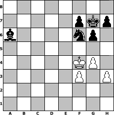 game notation in PGN-format [Event "Endlich Fr"] [Site "www.myChess.de"] [Date "2014.03.25"] [Round "1"] [White "borsti"] [Black "muellerh"] [ECO "C41"] [WhitemyELO "1217"] [BlackmyELO "1521"] [Result "0-1"] [TimeControl "10/1728000"] [WhiteDays "100"] [BlackDays "091"] [MyChessNo "93591"] 1. e4 e5 2. Nf3 d6 3. Bb5+ c6 4. Ba4 b5 5. Bb3 Nf6 6. d3 Be7 7. h3 O-O 8. Nc3 a5 9. a4 b4 10. Ne2 Bb7 11. Be3 Qc7 12. Ng3 Re8 13. O-O d5 14. Qd2 Rd8 15. Qe1 c5 16. Nf5 dxe4 17. dxe4 Bxe4 18. Nxe7+ Qxe7 19. Qe2 Nc6 20. c4 Nd4 21. Bxd4 exd4 22. Rae1 Qe8 23. Bc2 d3 24. Bxd3 Bxd3 25. Qxe8+ Rxe8 26. Rxe8+ Rxe8 27. Rc1 Re4 28. b3 Nh5 29. Ne1 Rd4 30. g3 Nf6 31. f3 Be2 32. Kf2 Rd2 33. g4 Bxc4+ 34. Kg3 Bxb3 35. Rxc5 g6 36. Rxa5 Ra2 37. Ra8+ Kg7 38. a5 Bc4 39. Ng2 b3 40. Ne3 Bd3 41. Nd1 b2 42. Nxb2 Rxb2 43. a6 Ra2 44. Kf4 Rxa6 45. Rxa6 Bxa6 0-1 position notation in FEN-format 8/5pkp/b4np1/8/5KP1/5P1P/8/8 - - - 0 46 Captured white pieces: Captured black pieces: Click on a captured piece in order to display the desired move!