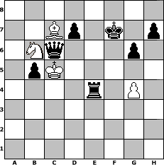 game notation in PGN-format [Event "960 Chess Fun"] [Site "www.myChess.de"] [Date "2006.03.14"] [Round "1"] [White "stierdame1965"] [Black "Caligula"] [Variant "Fischerrandom"] [SetUp "1"] [FEN "nrnqkrbb/pppppppp/8/8/8/8/PPPPPPPP/NRNQKRBB w KQkq - 0 1"] [WhitemyELO "1012"] [BlackmyELO "1458"] [Result "0-1"] [TimeControl "10/864000"] [WhiteDays "10"] [BlackDays "10"] [MyChessNo "23556"] 1. e4 g6 2. f4 e5 3. fxe5 Bxe5 4. d4 Bg7 5. Qe2 Nab6 6. e5 Ne7 7. Nab3 f6 8. c4 Bxc4 9. Qe4 Bxf1 10. Kxf1 Nc4 11. g4 fxe5+ 12. Ke2 Rf4 13. Qd3 b5 14. dxe5 Nxe5 15. Bxa7 Nxd3 16. Nxd3 Nd5 17. Bxd5 Qe7+ 18. Kd1 Rf1+ 19. Kc2 Qe2+ 20. Nd2 Rxb1 21. Bf3 Qxh2 22. Bxb8 Ra1 23. Nb4 Bxb2 24. Kxb2 Qe5+ 25. Ka3 Qc3+ 26. Nb3 Rb1 27. Nd5 Qb2+ 28. Kb4 Qxa2 29. Nf6+ Ke7 30. Nd5+ Kf7 31. Bxc7 Qxb3+ 32. Kc5 Rc1+ 33. Kd6 Re1 34. Be4 Rxe4 35. Nb6 Qe6+ 36. Kc5 Qc6# 0-1 position notation in FEN-format 8/2Bp1k1p/1Nq3p1/1pK5/4r1P1/8/8/8 - - - 4 37 Captured white pieces: Captured black pieces: Click on a captured piece in order to display the desired move!