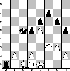 game notation in PGN-format [Event "> 1500"] [Site "www.myChess.de"] [Date "2010.03.18"] [Round "1"] [White "Master1"] [Black "commander"] [ECO "D20"] [WhitemyELO "1261"] [BlackmyELO "1172"] [Result "1-0"] [TimeControl "10/2592000"] [WhiteDays "120"] [BlackDays "000"] [MyChessNo "64076"] 1. d4 d5 2. c4 dxc4 3. e4 b5 4. a4 a6 5. axb5 Bb7 6. bxa6 Rxa6 7. Bxc4 Rxa1 8. Na3 Bxe4 9. f3 Bb7 10. Ne2 Nf6 11. O-O g6 12. Qa4+ Bc6 13. Bb5 Bxb5 14. Qxb5+ c6 15. Qb3 e6 16. Rd1 Nd5 17. Nc3 Na6 18. Nxd5 cxd5 19. Qb5+ Qd7 20. Qxa6 Bg7 21. Qb5 Qxb5 22. Nxb5 Kd7 23. Kf1 Rb8 24. Nc3 h5 25. Ke1 Be5 26. dxe5 Kc6 27. g3 Rb3 28. Ne2 Rxf3 29. Nd4+ Kc5 30. Nxf3 1-0 position notation in FEN-format 8/5p2/4p1p1/2kpP2p/8/5NP1/1P1P3P/r1BRK3 - - - 0 30 Captured white pieces: Captured black pieces: Click on a captured piece in order to display the desired move!