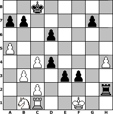game notation in PGN-format [Event "unter uns Nr. 46 (Faslam)"] [Site "www.myChess.de"] [Date "2019.02.24"] [Round "1"] [White "lotchi"] [Black "S04boy"] [ECO "A00"] [WhitemyELO "1067"] [BlackmyELO "1214"] [Result "0-1"] [TimeControl "10/864000"] [WhiteDays "22"] [BlackDays "26"] [MyChessNo "114454"] 1. Nc3 e5 2. e4 c6 3. Nf3 Bb4 4. a3 Bxc3 5. dxc3 d6 6. Bg5 f6 7. Be3 Bg4 8. Be2 c5 9. h3 Bxf3 10. Bxf3 Qb6 11. b3 Nc6 12. c4 O-O-O 13. O-O Nd4 14. Bxd4 cxd4 15. a4 Nh6 16. Bg4+ Nxg4 17. hxg4 Qb4 18. Qe1 Qxe1 19. Rxe1 h5 20. f3 hxg4 21. fxg4 Rh4 22. Rf1 Rxg4 23. Rad1 Rxe4 24. Rd3 Rh8 25. Rh3 Rxh3 26. gxh3 Re2 27. Rc1 f5 28. Rf1 f4 29. Rc1 f3 30. Kf1 e4 31. a5 e3 32. h4 Rh2 0-1 position notation in FEN-format 2k5/pp4p1/3p4/P7/2Pp3P/1P2pp2/2P4r/1NR2K2 - - - 1 33 Captured white pieces: Captured black pieces: Click on a captured piece in order to display the desired move!