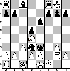 game notation in PGN-format [Event "Amateur´s Mind"] [Site "www.myChess.de"] [Date "2025.03.20"] [Round "1"] [White "Alencar"] [Black "kalle"] [ECO "A45"] [WhitemyELO "1473"] [BlackmyELO "1645"] [Result "0-1"] [TimeControl "10/2592000"] [WhiteDays "21"] [BlackDays "30"] [MyChessNo "133082"] 1. d4 Nf6 2. d5 d6 3. Nc3 c6 4. dxc6 Nxc6 5. Nd5 e6 6. Nxf6+ Qxf6 7. Nf3 d5 8. c3 Bc5 9. Be3 Bxe3 10. fxe3 O-O 11. Nd4 Qh4+ 12. g3 Qe4 13. Rg1 Qxe3 14. Rg2 Ne5 15. Qc1 Nd3+ 0-1 position notation in FEN-format r1b2rk1/pp3ppp/4p3/3p4/3N4/2Pnq1P1/PP1PP1RP/R1Q1KB2 - Q - 4 16 Captured white pieces: Captured black pieces: Click on a captured piece in order to display the desired move!
