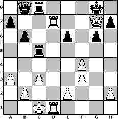game notation in PGN-format [Event "Gewitter im August"] [Site "www.myChess.de"] [Date "2006.08.13"] [Round "1"] [White "Phantasos"] [Black "helrobe"] [ECO "C14"] [WhitemyELO "2039"] [BlackmyELO "1844"] [Result "1-0"] [TimeControl "10/864000"] [WhiteDays "26"] [BlackDays "29"] [MyChessNo "27661"] 1. e4 e6 2. d4 d5 3. Nc3 Nf6 4. Bg5 Be7 5. e5 Nfd7 6. Bxe7 Qxe7 7. f4 O-O 8. Nf3 c5 9. dxc5 Nxc5 10. Bd3 Nxd3+ 11. Qxd3 Nc6 12. a3 Bd7 13. O-O-O Na5 14. Nxd5 exd5 15. Qxd5 Bc6 16. Qxa5 Bxf3 17. gxf3 Rfc8 18. Rd4 Rc5 19. Qb4 Rac8 20. c3 Qc7 21. Rhd1 b6 22. Rd7 Qb8 23. Qd4 g6 24. e6 fxe6 25. Qg7# 1-0 position notation in FEN-format 1qr3k1/p2R2Qp/1p2p1p1/2r5/5P2/P1P2P2/1P2P2P/2KR4 - - - 1 25 Captured white pieces: Captured black pieces: Click on a captured piece in order to display the desired move!