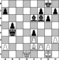 game notation in PGN-format [Event "Schach am laufenden Band"] [Site "www.myChess.de"] [Date "2017.10.17"] [Round "1"] [White "Rabenvogel"] [Black "Helmut48"] [ECO "A45"] [WhitemyELO "1548"] [BlackmyELO "1960"] [Result "0-1"] [TimeControl "10/1728000"] [WhiteDays "20"] [BlackDays "20"] [MyChessNo "109973"] 1. d4 Nf6 2. Nc3 d5 3. Bg5 Nbd7 4. e3 g6 5. Nf3 Bg7 6. Bxf6 Nxf6 7. h3 O-O 8. Be2 Ne4 9. Nxe4 dxe4 10. Nd2 c5 11. c3 cxd4 12. cxd4 e5 13. dxe5 Qa5 14. O-O Qxe5 15. Nc4 Qc5 16. Qc2 Be6 17. Rfb1 Rfc8 18. Rc1 b5 19. Na3 Qb4 20. Qd1 Bxb2 21. Rxc8+ Rxc8 22. Nc2 Rxc2 23. Qxc2 Bxa1 24. Qd1 Bf6 0-1 position notation in FEN-format 6k1/p4p1p/4bbp1/1p6/1q2p3/4P2P/P3BPP1/3Q2K1 - - - 2 25 Captured white pieces: ![]() ![]() ![]() ![]() ![]() ![]() ![]() ![]() ![]() ![]() ![]() ![]() ![]() ![]() ![]() Captured black pieces: ![]() ![]() ![]() ![]() ![]() ![]() ![]() ![]() ![]() ![]() ![]() ![]() ![]() ![]() ![]() Click on a captured piece in order to display the desired move!