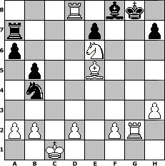 game notation in PGN-format [Event "Albspiele 18"] [Site "www.myChess.de"] [Date "2012.01.27"] [Round "1"] [White "reisinger"] [Black "Haki"] [ECO "E61"] [WhitemyELO "1442"] [BlackmyELO "1330"] [Result "1-0"] [TimeControl "10/1728000"] [WhiteDays "20"] [BlackDays "20"] [MyChessNo "79415"] 1. d4 Nf6 2. c4 g6 3. Nc3 Bg7 4. Bf4 O-O 5. h3 d6 6. e3 c5 7. Qc2 cxd4 8. exd4 d5 9. Nf3 dxc4 10. Bxc4 Nc6 11. O-O-O a6 12. Ne5 Nxd4 13. Qd3 Ne6 14. Qe3 Qc7 15. Bh2 b5 16. Bxe6 fxe6 17. Nxg6 Qa7 18. Qxa7 Rxa7 19. Nxf8 Bxf8 20. Rd8 Bb7 21. Be5 Bxg2 22. Rg1 Nd5 23. Rxg2+ Kf7 24. Ne4 Nb4 25. Ng5+ Kg8 26. Nxe6+ 1-0 position notation in FEN-format 3R1bk1/r3p2p/p3N3/1p2B3/1n6/7P/PP1P1PR1/2K5 - - - 0 26 Captured white pieces: Captured black pieces: Click on a captured piece in order to display the desired move!