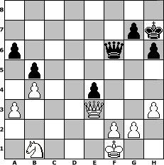 game notation in PGN-format [Event "Alte Kameraden :-))"] [Site "www.myChess.de"] [Date "2013.05.29"] [Round "1"] [White "Erich"] [Black "woern63"] [ECO "A00"] [WhitemyELO "2041"] [BlackmyELO "1823"] [Result "1/2-1/2"] [TimeControl "10/2592000"] [WhiteDays "120"] [BlackDays "100"] [MyChessNo "88492"] 1. Nc3 d5 2. d4 Nf6 3. Bg5 Bf5 4. e3 e6 5. Bd3 Bxd3 6. cxd3 Nbd7 7. Nf3 h6 8. Bxf6 Qxf6 9. O-O c6 10. Qb3 Rb8 11. Qa4 a6 12. Re1 Bd6 13. e4 Qd8 14. Qc2 O-O 15. h3 Rc8 16. Qd2 Be7 17. Qe2 Bg5 18. a3 Re8 19. Qd1 b5 20. Re2 Bf4 21. Rc2 Bb8 22. b4 dxe4 23. dxe4 e5 24. d5 Nb6 25. Rac1 cxd5 26. Nxd5 Rxc2 27. Rxc2 f5 28. Rc6 fxe4 29. Rxb6 exf3 30. Qxf3 e4 31. Qh5 Re5 32. Qg4 Rxd5 33. Rxb8 Qxb8 34. Qe6+ Kh8 35. Qxd5 Qf4 36. Qc5 Kh7 37. Kf1 Qf6 38. Qe3 1/2-1/2 position notation in FEN-format 8/6pk/p4q1p/1p6/1P2p3/P3Q2P/5PP1/1N3K2 - - - 6 38 Captured white pieces: Captured black pieces: Click on a captured piece in order to display the desired move!