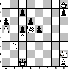game notation in PGN-format [Event "Eine zentrale Er"] [Site "www.myChess.de"] [Date "2009.05.20"] [Round "1"] [White "Knight"] [Black "Juliette2103"] [ECO "C65"] [WhitemyELO "1098"] [BlackmyELO "1498"] [Result "1/2-1/2"] [TimeControl "10/2592000"] [WhiteDays "119"] [BlackDays "050"] [MyChessNo "55915"] 1. e4 e5 2. Nf3 Nc6 3. Bb5 Nf6 4. Nc3 d6 5. O-O Be7 6. Nd5 Be6 7. Nxf6+ gxf6 8. d3 f5 9. exf5 Bxf5 10. b3 a6 11. Bxc6+ bxc6 12. Bb2 O-O 13. Re1 Bf6 14. c4 c5 15. g3 Kh8 16. h4 Rg8 17. a4 Bxh4 18. Nh2 Bf6 19. a5 Qd7 20. Qe2 Bh4 21. Qf3 Bh3 22. Kh1 Bg5 23. Bc1 Bxc1 24. Raxc1 Rg6 25. Rb1 Rag8 26. Rg1 f5 27. Rbe1 f4 28. Re4 fxg3 29. fxg3 Bf5 30. Re3 Rh6 31. Qg2 Bh3 32. Qf2 Qe7 33. g4 Rf8 34. Qg3 Rf1 35. Rxf1 Bxf1 36. g5 Rh3 37. Qf2 Rxe3 38. Qxe3 Bxd3 39. Qxd3 Qxg5 40. Qd5 Qc1+ 1/2-1/2 position notation in FEN-format 7k/2p4p/p2p4/P1pQp3/2P5/1P6/7N/2q4K - - - 2 41 Captured white pieces: Captured black pieces: Click on a captured piece in order to display the desired move!