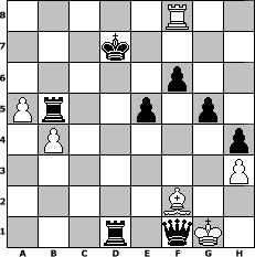 game notation in PGN-format [Event "Sp"] [Site "www.myChess.de"] [Date "2011.09.01"] [Round "1"] [White "augustus"] [Black "Hobbykegler"] [ECO "C23"] [WhitemyELO "1262"] [BlackmyELO "1050"] [Result "0-1"] [TimeControl "10/2592000"] [WhiteDays "073"] [BlackDays "137"] [MyChessNo "76043"] 1. e4 e5 2. Bc4 Qe7 3. Nc3 d6 4. f3 Bd7 5. Nd5 Qd8 6. d3 Nf6 7. Bg5 h6 8. Bh4 g5 9. Bg3 c6 10. Nxf6+ Qxf6 11. Ne2 b5 12. Bb3 Na6 13. c3 Be7 14. O-O h5 15. h3 h4 16. Bh2 Rb8 17. a3 d5 18. Bc2 Bc5+ 19. Kh1 Be3 20. b4 dxe4 21. fxe4 Qe6 22. Bb3 Qd6 23. Nc1 Rg8 24. Qf3 Rf8 25. Qxe3 f6 26. Ne2 Kd8 27. d4 Qe7 28. d5 cxd5 29. Bxd5 Nc7 30. Rad1 Nxd5 31. Rxd5 Qe6 32. Qc5 Re8 33. Rfd1 Rb7 34. Qc8+ Kxc8 35. Rc1 Bc6 36. Rc5 Rb6 37. c4 Rd8 38. cxb5 Rd6 39. a4 Kd8 40. Bg1 Bxe4 41. a5 Rb8 42. Rc7 Qd5 43. Rxa7 Bxg2+ 44. Kh2 Bh1 45. Bb6+ Ke8 46. Rxh1 Qd2 47. Rf1 Qxe2+ 48. Kg1 Rd2 49. Bf2 Rxb5 50. Rc7 Rd1 51. Rc8+ Kd7 52. Rf8 Qxf1+ 0-1 position notation in FEN-format 5R2/3k4/5p2/Pr2p1p1/1P5p/7P/5B2/3r1qK1 - - - 0 53 Captured white pieces: Captured black pieces: Click on a captured piece in order to display the desired move!