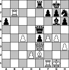 game notation in PGN-format [Event " Fluegel Gambit"] [Site "www.myChess.de"] [Date "2005.12.13"] [Round "2"] [White "bane"] [Black "nogumo"] [ECO "B20"] [WhitemyELO "1469"] [BlackmyELO "1893"] [Result "1-0"] [TimeControl "10/2592000"] [WhiteDays "90"] [BlackDays "87"] [MyChessNo "20682"] 1. e4 c5 2. b4 cxb4 3. a3 d5 4. exd5 Qxd5 5. Bb2 e5 6. axb4 Bxb4 7. Na3 Nf6 8. Nb5 O-O 9. Nf3 Bg4 10. c3 Bd6 11. c4 Qe6 12. Nxd6 Qxd6 13. Ba3 Qe6 14. Bxf8 e4 15. Nd4 Qd7 16. Qc1 Qxd4 17. Bb4 Nc6 18. Bc3 Qd6 19. Qa3 Qf4 20. Qc5 Re8 21. Qe3 Qd6 22. h3 Bh5 23. g4 Bg6 24. Be2 a6 25. Rb1 Ne5 26. Bxe5 Qxe5 27. Rxb7 h6 28. O-O Nh7 29. f4 1-0 position notation in FEN-format 4r1k1/1R3ppn/p5bp/4q3/2P1pPP1/4Q2P/3PB3/5RK1 - - - 0 29 Captured white pieces: Captured black pieces: Click on a captured piece in order to display the desired move!