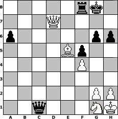 game notation in PGN-format [Event "John Owen Turnier 2011"] [Site "www.myChess.de"] [Date "2011.01.26"] [Round "1"] [White "Svetlana"] [Black "Rotstift10"] [ECO "B00"] [WhitemyELO "1541"] [BlackmyELO "1583"] [Result "1-0"] [TimeControl "10/2592000"] [WhiteDays "28"] [BlackDays "29"] [MyChessNo "71513"] 1. e4 b6 2. d4 Bb7 3. Bd3 e6 4. Nh3 Nc6 5. Be3 Nb4 6. Nc3 Nxd3+ 7. cxd3 Bb4 8. O-O Bxc3 9. bxc3 h6 10. Qg4 g6 11. a4 Nf6 12. Qe2 Qe7 13. a5 a6 14. axb6 cxb6 15. Rfb1 b5 16. e5 Nd5 17. Bd2 Qh4 18. c4 Nc7 19. Ba5 Rc8 20. Qe3 O-O 21. f3 f5 22. d5 exd5 23. Qa7 dxc4 24. Qxb7 Qd4+ 25. Kh1 Qxe5 26. dxc4 bxc4 27. f4 Qe3 28. Bxc7 c3 29. Be5 c2 30. Qxd7 cxb1=Q+ 31. Rxb1 Rc1+ 32. Rxc1 Qxc1+ 33. Ng1 1-0 position notation in FEN-format 5rk1/3Q4/p5pp/4Bp2/5P2/8/6PP/2q3NK - - - 1 33 Captured white pieces: ![]() ![]() ![]() ![]() ![]() ![]() ![]() ![]() ![]() ![]() ![]() ![]() ![]() ![]() ![]() Captured black pieces: ![]() ![]() ![]() ![]() ![]() ![]() ![]() ![]() ![]() ![]() ![]() ![]() ![]() ![]() ![]() Click on a captured piece in order to display the desired move!