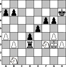 game notation in PGN-format [Event "Schicht im Schacht :-)"] [Site "www.myChess.de"] [Date "2018.03.31"] [Round "1"] [White "lotchi"] [Black "miu"] [ECO "A00"] [WhitemyELO "1084"] [BlackmyELO "1507"] [Result "0-1"] [TimeControl "10/2592000"] [WhiteDays "087"] [BlackDays "119"] [MyChessNo "111852"] 1. Nc3 Nf6 2. Nf3 g6 3. e4 d6 4. Bb5+ Bd7 5. Bxd7+ Nbxd7 6. d3 Bg7 7. Bg5 O-O 8. O-O c6 9. Bxf6 Bxf6 10. a4 e5 11. Qd2 Bg7 12. h3 Qc7 13. b3 Rac8 14. Qe3 Nf6 15. Qd2 d5 16. exd5 Nxd5 17. Nxd5 cxd5 18. Rac1 h5 19. Ne1 Kh7 20. f3 Bh6 21. Qd1 Bxc1 22. Qxc1 Qc3 23. g4 hxg4 24. fxg4 Qxb3 25. cxb3 Rxc1 26. Ng2 Rxf1+ 27. Kxf1 d4 28. Nh4 Rc8 29. Nf3 f6 30. Kg2 Rc3 31. Kg3 Rxd3 0-1 position notation in FEN-format 8/pp5k/5pp1/4p3/P2p2P1/1P1r1NKP/8/1N6 - - - 0 32 Captured white pieces: Captured black pieces: Click on a captured piece in order to display the desired move!