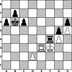 game notation in PGN-format [Event "Auf ein Neues."] [Site "www.myChess.de"] [Date "2018.01.17"] [Round "1"] [White "Knight"] [Black "wolni55"] [ECO "D00"] [WhitemyELO "1082"] [BlackmyELO "1438"] [Result "0-1"] [TimeControl "10/2592000"] [WhiteDays "150"] [BlackDays "145"] [MyChessNo "111117"] 1. d4 d5 2. e4 dxe4 3. Nc3 h6 4. Nxe4 Nf6 5. Ng3 a6 6. Nf3 Nc6 7. Be2 Bg4 8. O-O e6 9. c3 Bd6 10. Re1 Bxg3 11. fxg3 Bf5 12. Bf4 Qe7 13. Bd3 Bxd3 14. Qxd3 O-O-O 15. Ne5 Nxe5 16. Bxe5 Rhg8 17. Bxf6 Qxf6 18. b4 Rd5 19. a4 g5 20. g4 Re8 21. Re4 Red8 22. g3 Qg6 23. Rd1 R8d6 24. h3 f6 25. h4 e5 26. h5 Qh7 27. Kg2 f5 28. gxf5 Qxf5 29. Rf1 Qh7 30. Rfe1 Rd8 31. g4 Qd7 32. Kh3 exd4 33. cxd4 Rxd4 34. Rxd4 Qxd4 35. Qxd4 Rxd4 36. Rb1 c6 37. Kg3 Kc7 38. Kf3 Kd6 39. Rb3 Kd5 40. a5 Kc4 41. Rb1 Kb5 42. Rb3 Rxb4 43. Re3 Kxa5 44. Ra3+ Kb6 45. Re3 Rf4+ 0-1 position notation in FEN-format 8/1p6/pkp4p/6pP/5rP1/4RK2/3P4/8 - - - 4 46 Captured white pieces: Captured black pieces: Click on a captured piece in order to display the desired move!