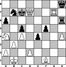 game notation in PGN-format [Event "3. Chess960/1"] [Site "www.myChess.de"] [Date "2009.04.06"] [Round "1"] [White "cebulon@"] [Black "miluetz"] [Variant "Fischerrandom"] [SetUp "1"] [FEN "rqknnrbb/pppppppp/8/8/8/8/PPPPPPPP/RQKNNRBB w KQkq - 0 1"] [WhitemyELO "1500"] [BlackmyELO "1502"] [Result "1-0"] [TimeControl "10/3456000"] [WhiteDays "140"] [BlackDays "154"] [MyChessNo "54652"] 1. f4 h6 2. g3 Bh7 3. e4 e6 4. Bd4 Nc6 5. Bc3 g5 6. b3 Bxc3 7. Nxc3 Nd4 8. fxg5 hxg5 9. Qb2 Nd6 10. Nd5 exd5 11. Qxd4 dxe4 12. Qg7 Re8 13. Qxh7 f5 14. c4 c5 15. Nc2 Qc7 16. h4 gxh4 17. gxh4 Qd8 18. Qh6 Re6 19. Qf4 Qh8 20. O-O-O O-O-O 21. Bg2 Qg7 22. Rf2 Rh8 23. Rh1 Rhh6 24. Bf1 a6 25. Kb1 b6 26. Ne3 Ref6 27. Nd5 Re6 28. Rg2 Reg6 29. Rhg1 Rxg2 30. Rxg2 Qh7 31. Nxb6+ Kc7 32. Na4 Kc6 33. Qe5 Nb7 34. Rg7 Qh8 35. Qd5+ Kc7 36. Qxd7+ 1-0 position notation in FEN-format 7q/1nkQ2R1/p6r/2p2p2/N1P1p2P/1P6/P2P4/1K3B2 - - - 0 36 Captured white pieces: Captured black pieces: Click on a captured piece in order to display the desired move!