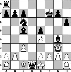 | game notation in PGN-format [Event "spass mit m"] [Site "www.myChess.de"] [Date "2005.03.21"] [Round "1"] [White "EduardM"] [Black "Nightflight"] [ECO "C50"] [WhitemyELO "1433"] [BlackmyELO "1550"] [Result "0-1"] [TimeControl "10/3456000"] [WhiteDays "75"] [BlackDays "67"] [MyChessNo "11348"] 1. e4 e5 2. Nf3 Nc6 3. Bc4 Bc5 4. d3 Nf6 5. Ng5 O-O 6. c3 h6 7. Nxf7 Rxf7 8. Bxf7+ Kxf7 9. Qf3 d5 10. Nd2 dxe4 11. Nxe4 Bg4 12. Qg3 Nxe4 13. dxe4 Qd1# 0-1 position notation in FEN-format r7/ppp2kp1/2n4p/2b1p3/4P1b1/2P3Q1/PP2PPPP/R1BqK2R - KQ - 1 14 Captured white pieces:                              Captured black pieces:                               Click on a captured piece in order to display the desired move!