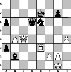 game notation in PGN-format [Event "Winter 2011/12"] [Site "www.myChess.de"] [Date "2011.12.22"] [Round "2"] [White "bjeu"] [Black "retep1"] [ECO "B50"] [WhitemyELO "2115"] [BlackmyELO "1805"] [Result "1/2-1/2"] [TimeControl "10/2592000"] [WhiteDays "005"] [BlackDays "150"] [MyChessNo "78443"] 1. e4 c5 2. Nf3 d6 3. d3 Nc6 4. Be2 e5 5. O-O Nf6 6. c3 Bd7 7. Nbd2 Be7 8. a3 O-O 9. b4 a6 10. Bb2 b5 11. d4 c4 12. d5 Na7 13. a4 Qb8 14. Re1 Qb7 15. Bc1 Nc8 16. h3 Ne8 17. Nf1 f5 18. exf5 Bxf5 19. Ng5 Nb6 20. Ne6 Nxa4 21. Rxa4 Bxe6 22. dxe6 bxa4 23. Bxc4 Nc7 24. Bg5 Bxg5 25. e7+ Rf7 26. Bxf7+ Kxf7 27. Qh5+ Kf6 28. Ng3 Bh6 29. Ne4+ Kxe7 30. Nxd6 Qc6 31. Rd1 Rf8 32. Qxe5+ Ne6 33. Nf5+ Rxf5 34. Qxf5 Bg5 35. Qxh7 Qxc3 36. Qe4 a3 37. Re1 Qc8 38. Qd5 Bf6 39. Re3 Bb2 40. h4 Qd7 41. Qc4 Qd6 1/2-1/2 position notation in FEN-format 8/4k1p1/p2qn3/8/1PQ4P/p3R3/1b3PP1/6K1 - - - 3 42 Captured white pieces: Captured black pieces: Click on a captured piece in order to display the desired move!