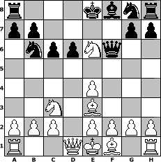 game notation in PGN-format [Event "160 Jahre Turnierschach - London 1851"] [Site "www.myChess.de"] [Date "2011.02.20"] [Round "1"] [White "Lemmi11"] [Black "BobbyF4"] [ECO "C40"] [WhitemyELO "1762"] [BlackmyELO "1573"] [Result "1-0"] [TimeControl "10/1728000"] [WhiteDays "40"] [BlackDays "00"] [MyChessNo "72168"] 1. e4 e5 2. Nf3 f5 3. Nxe5 Qf6 4. d3 d6 5. Nf3 fxe4 6. dxe4 Be6 7. Nc3 c6 8. Ng5 Nd7 9. Be3 Nb6 10. Nxe6 1-0 position notation in FEN-format r3kbnr/pp4pp/1nppNq2/8/4P3/2N1B3/PPP1PPPP/R2QKB1R - KQkq - 0 10 Captured white pieces: Captured black pieces: Click on a captured piece in order to display the desired move!