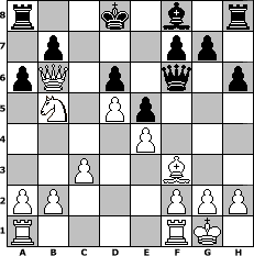 game notation in PGN-format [Event "3. Norderstedter DENK MAL Open 2012"] [Site "www.myChess.de"] [Date "2012.02.08"] [Round "1"] [White "Haki"] [Black "borsti"] [ECO "C41"] [WhitemyELO "1304"] [BlackmyELO "1222"] [Result "1-0"] [TimeControl "10/2592000"] [WhiteDays "30"] [BlackDays "30"] [MyChessNo "79799"] 1. e4 e5 2. Nf3 d6 3. d4 Bg4 4. Be2 Bxf3 5. Bxf3 Nc6 6. c3 h6 7. O-O Qf6 8. d5 Na5 9. Qa4+ Kd8 10. Qxa5 Ne7 11. Na3 Nc8 12. Nb5 Nb6 13. Be3 a6 14. Bxb6 cxb6 15. Qxb6+ 1-0 position notation in FEN-format r2k1b1r/1p3pp1/pQ1p1q1p/1N1Pp3/4P3/2P2B2/PP3PPP/R4RK1 - - - 0 15 Captured white pieces: ![]() ![]() ![]() ![]() ![]() ![]() ![]() ![]() ![]() ![]() ![]() ![]() ![]() ![]() ![]() Captured black pieces: ![]() ![]() ![]() ![]() ![]() ![]() ![]() ![]() ![]() ![]() ![]() ![]() ![]() ![]() ![]() Click on a captured piece in order to display the desired move!