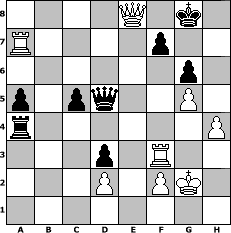 game notation in PGN-format [Event "Novembernebel"] [Site "www.myChess.de"] [Date "2014.10.16"] [Round "2"] [White "orion"] [Black "hape50"] [ECO "D10"] [WhitemyELO "1687"] [BlackmyELO "1346"] [Result "1-0"] [TimeControl "10/2592000"] [WhiteDays "30"] [BlackDays "30"] [MyChessNo "96382"] 1. d4 d5 2. c4 c6 3. e3 Nf6 4. Nf3 h6 5. Nc3 e6 6. Bd3 Be7 7. O-O O-O 8. e4 dxe4 9. Nxe4 b6 10. Nxf6+ Bxf6 11. Bc2 Bb7 12. Qd3 g6 13. Bxh6 c5 14. Bxf8 Qxf8 15. Rae1 Nc6 16. d5 Nb4 17. Qb3 exd5 18. Re2 d4 19. a3 Nc6 20. Be4 Rb8 21. Qc2 Ne7 22. b4 Rd8 23. Rd1 Bxe4 24. Qxe4 Rd6 25. bxc5 bxc5 26. a4 a5 27. g4 Re6 28. Qc2 Rd6 29. h4 Rd7 30. Rd3 Qb8 31. Qb3 Rb7 32. Qc2 Rb1+ 33. Kg2 Rb4 34. g5 Bg7 35. Rxe7 Qd8 36. Qe2 Kf8 37. Ra7 Rxc4 38. Qe4 Rxa4 39. Ne5 Bxe5 40. Qxe5 Kg8 41. Qe7 Qd5+ 42. Rf3 d3 43. Qe8+ 1-0 position notation in FEN-format 4Q1k1/R4p2/6p1/p1pq2P1/r6P/3p1R2/3P1PK1/8 - - - 1 43 Captured white pieces: Captured black pieces: Click on a captured piece in order to display the desired move!