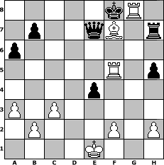 game notation in PGN-format [Event "Gothic 100"] [Site "www.myChess.de"] [Date "2005.08.23"] [Round "1"] [White "Kitama"] [Black "Gno"] [ECO "C01"] [WhitemyELO "1558"] [BlackmyELO "1379"] [Result "1-0"] [TimeControl "10/2592000"] [WhiteDays "120"] [BlackDays "120"] [MyChessNo "16612"] 1. e4 e6 2. d4 d5 3. Be3 dxe4 4. Nc3 Bb4 5. Nge2 Nc6 6. a3 Bxc3+ 7. Nxc3 f5 8. d5 exd5 9. Nxd5 Be6 10. Nf4 Qf6 11. c3 a6 12. Bd4 Ne5 13. Nh5 Qg5 14. Bxe5 Rd8 15. Nxg7+ Ke7 16. Bd4 Rxd4 17. Qxd4 Nf6 18. Nxe6 Kxe6 19. Bc4+ Ke7 20. Qe5+ Kf8 21. Qxc7 Qg6 22. Rd1 h5 23. Rd8+ Ne8 24. Qc5+ Kg7 25. Qe7+ Kh6 26. Bf7 Qxg2 27. Rd6+ Kh7 28. Bxe8+ Qg7 29. Rg1 Qxe7 30. Bg6+ Kg8 31. Re6 Qc5 32. Rf6 Rh7 33. Rxf5 Qe7 34. Bf7+ Kf8 35. Rg8# 1-0 position notation in FEN-format 5kR1/1p2qB1r/p7/5R1p/4p3/P1P5/1P3P1P/4K3 - - - 4 35 Captured white pieces: ![]() ![]() ![]() ![]() ![]() ![]() ![]() ![]() ![]() ![]() ![]() ![]() ![]() ![]() ![]() Captured black pieces: ![]() ![]() ![]() ![]() ![]() ![]() ![]() ![]() ![]() ![]() ![]() ![]() ![]() ![]() ![]() Click on a captured piece in order to display the desired move!