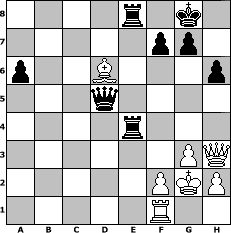 game notation in PGN-format [Event "Schachkings Miniturnier"] [Site "www.myChess.de"] [Date "2010.10.10"] [Round "1"] [White "gunni50"] [Black "Caligula"] [ECO "C50"] [WhitemyELO "1261"] [BlackmyELO "1384"] [Result "0-1"] [TimeControl "10/2592000"] [WhiteDays "30"] [BlackDays "30"] [MyChessNo "68875"] 1. e4 e5 2. Nf3 Nc6 3. Bc4 h6 4. Nc3 d6 5. O-O Nf6 6. d3 a6 7. Nd5 b5 8. Nxf6+ Qxf6 9. b3 bxc4 10. dxc4 Bb7 11. Bd2 Be7 12. a4 Nd4 13. Nxd4 exd4 14. Rc1 Bxe4 15. Ba5 Rc8 16. Qe2 Bc6 17. c3 O-O 18. cxd4 Qg5 19. d5 Bd7 20. Bd2 Qf6 21. Bc3 Qg6 22. Qxe7 Bh3 23. g3 Bxf1 24. Kxf1 Rfe8 25. Qh4 Qd3+ 26. Kg2 Re4 27. Qh3 Rce8 28. Ba5 Qxb3 29. Rf1 Qxa4 30. Bxc7 Qxc4 31. Bxd6 Qxd5 0-1 position notation in FEN-format 4r1k1/5pp1/p2B3p/3q4/4r3/6PQ/5PKP/5R2 - - - 0 32 Captured white pieces: Captured black pieces: Click on a captured piece in order to display the desired move!