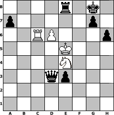 game notation in PGN-format [Event "In Memorium Michael Knopf"] [Site "www.myChess.de"] [Date "2012.04.10"] [Round "1"] [White "reisinger"] [Black "Master1"] [ECO "D10"] [WhitemyELO "1466"] [BlackmyELO "1355"] [Result "0-1"] [TimeControl "10/2592000"] [WhiteDays "120"] [BlackDays "113"] [MyChessNo "81125"] 1. d4 d5 2. c4 c6 3. Nc3 Nf6 4. Bf4 dxc4 5. e4 b5 6. a3 e6 7. Nf3 h6 8. b3 b4 9. axb4 Nh5 10. Bxb8 Rxb8 11. Ne5 Qg5 12. Nxc6 Rb7 13. bxc4 Nf4 14. d5 Bxb4 15. Qd2 Nxg2+ 16. Bxg2 Qxg2 17. O-O-O Ba3+ 18. Kc2 Rb2+ 19. Kd3 Rxd2+ 20. Kxd2 Qxf2+ 21. Ne2 Ba6 22. Rdf1 Qc5 23. Rb1 O-O 24. Rhc1 Bxc1+ 25. Rxc1 exd5 26. cxd5 Qf2 27. Ncd4 Qxh2 28. Rc6 Bxe2 29. Nxe2 Re8 30. Kd3 f5 31. Nc3 fxe4+ 32. Kd4 Qd2+ 33. Kc4 e3 34. d6 Rd8 35. Ne4 Qc2+ 36. Kd5 Qd3+ 37. Ke5 Re8+ 0-1 position notation in FEN-format 4r1k1/p5p1/2RP3p/4K3/4N3/3qp3/8/8 - - - 7 38 Captured white pieces: Captured black pieces: Click on a captured piece in order to display the desired move!