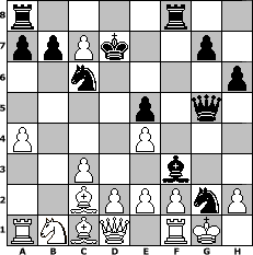 game notation in PGN-format [Event "Husarenritt"] [Site "www.myChess.de"] [Date "2005.11.23"] [Round "2"] [White "Vouivre"] [Black "otto01"] [ECO "C57"] [WhitemyELO "1462"] [BlackmyELO "2120"] [Result "0-1"] [TimeControl "10/1728000"] [WhiteDays "39"] [BlackDays "40"] [MyChessNo "19968"] 1. e4 e5 2. Nf3 Nc6 3. Bc4 Nf6 4. Ng5 Bc5 5. Bxf7+ Ke7 6. Bb3 Rf8 7. O-O h6 8. Nf3 d6 9. c3 Bg4 10. Bc2 Nh5 11. a4 Nf4 12. b4 Nxg2 13. bxc5 Bxf3 14. cxd6+ Kd7 15. dxc7 Qg5 0-1 position notation in FEN-format r4r2/ppPk2p1/2n4p/4p1q1/P3P3/2P2b2/2BPPPnP/RNBQ1RK1 - - - 1 16 Captured white pieces: Captured black pieces: Click on a captured piece in order to display the desired move!