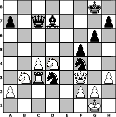 game notation in PGN-format [Event "Arpad Elo Geburtstagstunier"] [Site "www.myChess.de"] [Date "2011.08.23"] [Round "1"] [White "woern63"] [Black "muetoe"] [ECO "B22"] [WhitemyELO "1896"] [BlackmyELO "1778"] [Result "1-0"] [TimeControl "10/1728000"] [WhiteDays "18"] [BlackDays "12"] [MyChessNo "75683"] 1. e4 c5 2. c3 d5 3. exd5 Qxd5 4. Nf3 g6 5. Be2 Nf6 6. O-O Nc6 7. d4 Bg4 8. h3 Bf5 9. dxc5 Qxc5 10. Be3 Qd6 11. Qb3 Bg7 12. Qxb7 Rb8 13. Qa6 Rxb2 14. Rd1 Qc7 15. Bb5 Rxb5 16. Qxb5 O-O 17. Nbd2 Rb8 18. Qc4 Be6 19. Qh4 Bf5 20. Bh6 Bxh6 21. Qxh6 Bd3 22. Qe3 Bc2 23. Re1 Rd8 24. Rac1 Bf5 25. Nb3 Rd3 26. Qh6 e5 27. Red1 e4 28. Nfd4 Bd7 29. Rxd3 exd3 30. Qe3 Nd5 31. Qxd3 Ne5 32. Qe4 Nf6 33. Qe2 Nd5 34. c4 Nf4 35. Qe4 Ned3 36. Rc3 f5 37. Qf3 1-0 position notation in FEN-format 6k1/p1qb3p/6p1/5p2/2PN1n2/1NRn1Q1P/P4PP1/6K1 - - - 1 37 Captured white pieces: Captured black pieces: Click on a captured piece in order to display the desired move!