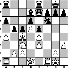 game notation in PGN-format [Event "Osterblitz"] [Site "www.myChess.de"] [Date "2006.04.14"] [Round "1"] [White "Juliette2103"] [Black "Pater"] [ECO "C50"] [WhitemyELO "1964"] [BlackmyELO "2094"] [Result "1/2-1/2"] [TimeControl "10/86400"] [WhiteDays "01"] [BlackDays "01"] [MyChessNo "24517"] 1. e4 e5 2. Nf3 Nc6 3. Bc4 Bc5 4. d3 Nf6 5. O-O d6 6. Nc3 Bg4 7. Be3 O-O 8. h3 Bxe3 9. fxe3 Bd7 10. d4 Na5 11. Be2 Re8 12. d5 c5 13. Nd2 Qe7 14. Nc4 Nxc4 15. Bxc4 a6 16. a4 b5 1/2-1/2 position notation in FEN-format r3r1k1/3bqppp/p2p1n2/1ppPp3/P1B1P3/2N1P2P/1PP3P1/R2Q1RK1 - - - 0 17 Captured white pieces: Captured black pieces: Click on a captured piece in order to display the desired move!