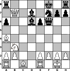 game notation in PGN-format [Event "D.A. - Schnell 1"] [Site "www.myChess.de"] [Date "2008.06.09"] [Round "1"] [White "Juliette2103"] [Black "RashimIbenRohal"] [ECO "C05"] [WhitemyELO "1626"] [BlackmyELO "1550"] [Result "1-0"] [TimeControl "10/864000"] [WhiteDays "01"] [BlackDays "10"] [MyChessNo "45489"] 1. e4 e6 2. d4 d5 3. Nd2 Nf6 4. e5 Nfd7 5. Ngf3 c5 6. c3 Nc6 7. Bd3 cxd4 8. cxd4 f6 9. O-O fxe5 10. dxe5 Ncxe5 11. Nxe5 Nxe5 12. Qh5+ Nf7 13. Re1 Bd6 14. Bb5+ Kf8 15. Nb3 Qf6 16. Qxd5 a6 17. Ba4 Bd7 18. Qxb7 1-0 position notation in FEN-format r4k1r/1Q1b1npp/p2bpq2/8/B7/1N6/PP2PPPP/R1B1R1K1 - - - 0 18 Captured white pieces: ![]() ![]() ![]() ![]() ![]() ![]() ![]() ![]() ![]() ![]() ![]() ![]() ![]() ![]() ![]() Captured black pieces: ![]() ![]() ![]() ![]() ![]() ![]() ![]() ![]() ![]() ![]() ![]() ![]() ![]() ![]() ![]() Click on a captured piece in order to display the desired move!