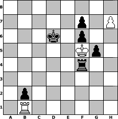 game notation in PGN-format [Event "Herbstman"] [Site "www.myChess.de"] [Date "2015.11.01"] [Round "1"] [White "lotchi"] [Black "muellerh"] [ECO "A06"] [WhitemyELO "1190"] [BlackmyELO "1467"] [Result "0-1"] [TimeControl "10/2592000"] [WhiteDays "29"] [BlackDays "30"] [MyChessNo "100993"] 1. Nf3 d5 2. d4 Nf6 3. Nc3 Bf5 4. Bg5 e6 5. Bxf6 Qxf6 6. e3 Nd7 7. Bb5 c6 8. Bd3 Bg4 9. Be2 Bb4 10. a3 Bxc3+ 11. bxc3 O-O 12. O-O b5 13. h3 Bh5 14. g4 Bg6 15. a4 e5 16. axb5 cxb5 17. dxe5 Nxe5 18. Nxe5 Qxe5 19. Qd2 a6 20. f4 Qf6 21. g5 Qe7 22. h4 Be4 23. Rf2 Rfd8 24. Bf3 Qe6 25. Qe2 Rac8 26. Bxe4 Qxe4 27. Rxa6 Rxc3 28. Qf3 Qxf3 29. Rxf3 Rxc2 30. Rf2 Rxf2 31. Kxf2 Rb8 32. Rd6 b4 33. Rxd5 b3 34. Rd1 b2 35. Rb1 Rb3 36. f5 Kf8 37. h5 Rb5 38. e4 Ke7 39. Kf3 Kd6 40. Kf4 h6 41. f6 hxg5+ 42. Kg4 gxf6 43. h6 Rb4 44. h7 Rxe4+ 45. Kf5 Rf4# 0-1 position notation in FEN-format 8/5p1P/3k1p2/5Kp1/5r2/8/1p6/1R6 - - - 2 46 Captured white pieces: Captured black pieces: Click on a captured piece in order to display the desired move!
