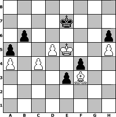 game notation in PGN-format [Event "PIRC"] [Site "www.myChess.de"] [Date "2005.02.11"] [Round "2"] [White "Pater"] [Black "bjeu"] [ECO "B07"] [WhitemyELO "1975"] [BlackmyELO "1776"] [Result "1-0"] [TimeControl "10/864000"] [WhiteDays "10"] [BlackDays "10"] [MyChessNo "10318"] 1. e4 d6 2. d4 Nf6 3. Nc3 g6 4. Bg5 Bg7 5. Qd2 h6 6. Be3 Ng4 7. Bf4 e5 8. dxe5 Nxe5 9. O-O-O Be6 10. Bxe5 Bxe5 11. f4 Bg7 12. Nf3 Nc6 13. Bb5 Qd7 14. Rhe1 O-O 15. h3 a6 16. Bf1 a5 17. a3 Ne7 18. g4 Qc6 19. f5 Bc8 20. e5 Qxf3 21. Bg2 Qg3 22. f6 dxe5 23. fxe7 Re8 24. Re3 Qf4 25. Nd5 Qc4 26. Qc3 Qxc3 27. Rxc3 e4 28. Nxc7 Rxe7 29. Rd8+ Kh7 30. Nxa8 Bxc3 31. bxc3 Be6 32. Nb6 f5 33. c4 Kg7 34. Nd5 Rf7 35. Rd6 Bxd5 36. cxd5 Rf6 37. Rxf6 Kxf6 38. c4 Ke5 39. Kd2 b6 40. gxf5 gxf5 41. a4 Kd6 42. h4 Ke5 43. Ke3 f4+ 44. Ke2 e3 45. Kd3 Kf6 46. Bf3 Ke5 47. h5 Kf6 48. Ke4 Ke7 49. Ke5 1-0 position notation in FEN-format 8/4k3/1p5p/p2PK2P/P1P2p2/4pB2/8/8 - - - 4 49 Captured white pieces: Captured black pieces: Click on a captured piece in order to display the desired move!