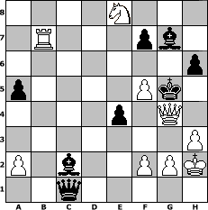 game notation in PGN-format [Event "unter uns Nr. 17"] [Site "www.myChess.de"] [Date "2014.02.13"] [Round "1"] [White "Wulfen49"] [Black "MiFie"] [ECO "C44"] [WhitemyELO "1223"] [BlackmyELO "1072"] [Result "1-0"] [TimeControl "10/864000"] [WhiteDays "40"] [BlackDays "39"] [MyChessNo "92910"] 1. e4 e5 2. Nf3 Nc6 3. d4 d6 4. d5 Nce7 5. Nc3 Nf6 6. Bg5 h6 7. Bxf6 gxf6 8. Bb5+ c6 9. dxc6 bxc6 10. Ba4 Bg7 11. O-O O-O 12. Ne2 Rb8 13. Rb1 Qa5 14. Nc3 Bg4 15. h3 Be6 16. b4 Qb6 17. b5 Qa5 18. Qd3 f5 19. Nh4 Rfd8 20. bxc6 Nxc6 21. exf5 Bd7 22. Rxb8 Rxb8 23. Rb1 Nb4 24. Qc4 Bxa4 25. Ng6 Bxc2 26. Ne7+ Kf8 27. Nc6 Rc8 28. Rxb4 Qa3 29. Nb5 Qc1+ 30. Kh2 a5 31. Nxd6 Rxc6 32. Qxc6 Ke7 33. Rb7+ Kf6 34. Ne8+ Kg5 35. Qf3 e4 36. Qg4# 1-0 position notation in FEN-format 4N3/1R3pb1/7p/p4Pk1/4p1Q1/7P/P1b2PPK/2q5 - - - 1 36 Captured white pieces: Captured black pieces: Click on a captured piece in order to display the desired move!