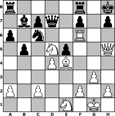 | game notation in PGN-format [Event "Zug um Zug gegen Fr"] [Site "www.myChess.de"] [Date "2010.05.04"] [Round "1"] [White "freizeitspieler"] [Black "Caligula"] [ECO "D02"] [WhitemyELO "1542"] [BlackmyELO "1360"] [Result "1-0"] [TimeControl "10/2592000"] [WhiteDays "90"] [BlackDays "90"] [MyChessNo "65339"] 1. d4 d5 2. Nf3 Nf6 3. g3 Nc6 4. Bg2 e6 5. O-O Be7 6. Bf4 Bd6 7. Bxd6 Qxd6 8. Nc3 O-O 9. Rc1 a6 10. Re1 b5 11. e4 Bb7 12. e5 Qb4 13. exf6 Qxb2 14. fxg7 Kxg7 15. Qd2 Qa3 16. Qg5+ Kh8 17. Qf6+ Kg8 18. Re3 Qxc1+ 19. Ne1 Qa3 20. Rf3 Qe7 21. Qf4 e5 22. Qg4+ Kh8 23. Nxd5 Qd6 24. Rf6 Qd8 25. Qh5 Qd7 26. Be4 1-0 position notation in FEN-format r4r1k/1bpq1p1p/p1n2R2/1p1Np2Q/3PB3/6P1/P1P2P1P/4N1K1 - - - 6 26 Captured white pieces:                              Captured black pieces:                               Click on a captured piece in order to display the desired move!