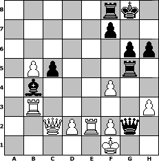 game notation in PGN-format [Event "Quicky-Blitz die Dritte"] [Site "www.myChess.de"] [Date "2009.08.02"] [Round "1"] [White "Master1"] [Black "Gauss1233"] [ECO "E70"] [WhitemyELO "1304"] [BlackmyELO "1369"] [Result "0-1"] [TimeControl "10/86400"] [WhiteDays "01"] [BlackDays "01"] [MyChessNo "58025"] 1. d4 Nf6 2. c4 g6 3. Nc3 Bg7 4. e4 d6 5. Bg5 O-O 6. Nf3 h6 7. Bxf6 Bxf6 8. Bd3 Bg7 9. O-O a6 10. Re1 Nc6 11. Bc2 Bg4 12. h3 Bxf3 13. gxf3 Nxd4 14. Rb1 c6 15. f4 b5 16. b3 Qa5 17. b4 Qb6 18. cxb5 Nxb5 19. Nxb5 axb5 20. Bb3 Rad8 21. Kg2 e6 22. a4 Bc3 23. Re2 Bxb4 24. axb5 c5 25. Bc4 Qb7 26. Rb3 d5 27. exd5 exd5 28. Bxd5 Rxd5 29. Qc2 Rg5+ 30. Kf1 Qg2# 0-1 position notation in FEN-format 5rk1/5p2/6pp/1Pp3r1/1b3P2/1R5P/2QPRPq1/5K2 - - - 4 31 Captured white pieces: Captured black pieces: Click on a captured piece in order to display the desired move!