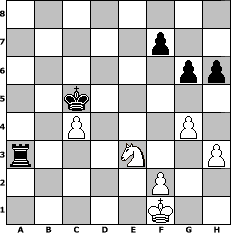 game notation in PGN-format [Event "Scottish Open"] [Site "www.myChess.de"] [Date "2007.10.22"] [Round "1"] [White "bernhard"] [Black "Andylein1989"] [ECO "A00"] [WhitemyELO "1614"] [BlackmyELO "1462"] [Result "1/2-1/2"] [TimeControl "10/864000"] [WhiteDays "38"] [BlackDays "40"] [MyChessNo "39172"] 1. b4 e5 2. b5 d6 3. d4 Bd7 4. e3 exd4 5. exd4 Nf6 6. Nf3 a6 7. bxa6 Nxa6 8. c4 Be7 9. d5 Nc5 10. h3 h6 11. Be3 Nfe4 12. Nfd2 Bf6 13. Nxe4 Bxa1 14. Nxc5 dxc5 15. Bxc5 Bf6 16. Qe2+ Be7 17. a3 b6 18. Bxb6 cxb6 19. d6 Be6 20. dxe7 Qxe7 21. Qe3 Bf5 22. Qxe7+ Kxe7 23. Nc3 Rxa3 24. Nd5+ Kd6 25. Nxb6 Rb8 26. Nd5 Rb2 27. Be2 Ra1+ 28. Bd1 Bc2 29. Ne3 Rbb1 30. Kd2 Bxd1 31. Rxd1 Rxd1+ 32. Nxd1 Kc5 33. Ne3 Ra2+ 34. Ke1 g6 35. g4 Ra3 36. Kf1 1/2-1/2 position notation in FEN-format 8/5p2/6pp/2k5/2P3P1/r3N2P/5P2/5K2 - - - 2 36 Captured white pieces: Captured black pieces: Click on a captured piece in order to display the desired move!