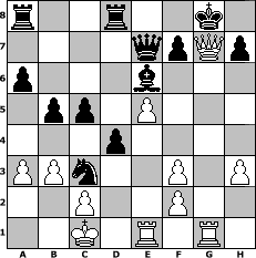 game notation in PGN-format [Event "unter uns Nr. 25 Adventturnier"] [Site "www.myChess.de"] [Date "2014.11.29"] [Round "1"] [White "S04boy"] [Black "Gauss1233"] [ECO "A06"] [WhitemyELO "1500"] [BlackmyELO "1411"] [Result "1-0"] [TimeControl "10/864000"] [WhiteDays "29"] [BlackDays "22"] [MyChessNo "96879"] 1. Nf3 d5 2. d4 e6 3. Nc3 Bb4 4. Bf4 Nf6 5. a3 Bd6 6. Bxd6 Qxd6 7. Qd3 Nc6 8. h3 O-O 9. Nb5 Qe7 10. O-O-O e5 11. dxe5 Nxe5 12. Qd4 Nxf3 13. gxf3 c5 14. Qh4 a6 15. Nc3 d4 16. Nd5 Nxd5 17. Qh5 Rd8 18. e4 Nb6 19. b3 Nd7 20. Bc4 Nf6 21. Qh4 b5 22. Bd5 Nxd5 23. Qg3 Nc3 24. Re1 Qd6 25. e5 Qe7 26. Rhg1 Be6 27. Qxg7# 1-0 position notation in FEN-format r2r2k1/4qpQp/p3b3/1pp1P3/3p4/PPn2P1P/2P2P2/2K1R1R1 - - - 0 27 Captured white pieces: Captured black pieces: Click on a captured piece in order to display the desired move!