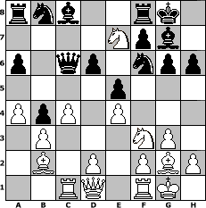 game notation in PGN-format [Event "Wrixum - Open die I."] [Site "www.myChess.de"] [Date "2004.12.11"] [Round "1"] [White "Chelly"] [Black "OwainGwynedd"] [ECO "A40"] [WhitemyELO "1665"] [BlackmyELO "1277"] [Result "1-0"] [TimeControl "10/2592000"] [WhiteDays "27"] [BlackDays "30"] [MyChessNo "8730"] 1. d4 g6 2. c4 Bg7 3. Nc3 Nf6 4. b3 d6 5. Nf3 e6 6. Bb2 a6 7. g3 O-O 8. Bg2 h6 9. O-O Qe8 10. a4 b6 11. e4 e5 12. d5 c6 13. Rc1 b5 14. dxc6 b4 15. Nd5 Qxc6 16. Ne7+ 1-0 position notation in FEN-format rnb2rk1/4Npb1/p1qp1npp/4p3/PpP1P3/1P3NP1/1B1P1PBP/2RQ1RK1 - - - 1 16 Captured white pieces: Captured black pieces: Click on a captured piece in order to display the desired move!