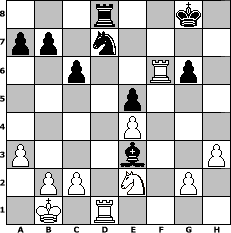 game notation in PGN-format [Event "Der Beste hinter den 1900ern(1/10) oder 10 hoch 2"] [Site "www.myChess.de"] [Date "2009.07.09"] [Round "1"] [White "Gambitianer"] [Black "Joschi"] [ECO "B12"] [WhitemyELO "1804"] [BlackmyELO "1580"] [Result "1-0"] [TimeControl "10/864000"] [WhiteDays "10"] [BlackDays "10"] [MyChessNo "57291"] 1. e4 c6 2. d4 d5 3. f3 dxe4 4. fxe4 e5 5. Nf3 Bg4 6. Bc4 Qxd4 7. Bxf7+ Kxf7 8. Ng5+ Ke8 9. Qxg4 Qd6 10. Qc8+ Qd8 11. Qxd8+ Kxd8 12. Nf7+ Ke7 13. Nxh8 Nf6 14. Bg5 Nbd7 15. Nc3 Ke8 16. a3 Bc5 17. O-O-O Kf8 18. Rhf1 Kg8 19. Ng6 hxg6 20. h3 Bd4 21. Bxf6 gxf6 22. Ne2 Be3+ 23. Kb1 Rd8 24. Rxf6 1-0 position notation in FEN-format 3r2k1/pp1n4/2p2Rp1/4p3/4P3/P3b2P/1PP1N1P1/1K1R4 - - - 0 24 Captured white pieces: Captured black pieces: Click on a captured piece in order to display the desired move!