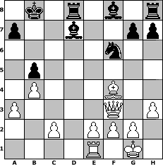game notation in PGN-format [Event "Sommerschach"] [Site "www.myChess.de"] [Date "2018.05.26"] [Round "1"] [White "MiFie"] [Black "alpacino"] [ECO "B01"] [WhitemyELO "1080"] [BlackmyELO "1317"] [Result "1-0"] [TimeControl "10/2592000"] [WhiteDays "29"] [BlackDays "30"] [MyChessNo "112223"] 1. e4 d5 2. Nc3 dxe4 3. Nxe4 Nf6 4. Bd3 Nxe4 5. Bxe4 c6 6. Nf3 Bd7 7. O-O f6 8. h3 Na6 9. d3 Nc5 10. a3 e5 11. b4 Na4 12. d4 Nc3 13. Qd2 Nxe4 14. Qe3 Nd6 15. dxe5 Nc4 16. Qf4 Nb6 17. Re1 Nd5 18. Qe4 fxe5 19. Nxe5 Nf6 20. Qc4 Qe7 21. Bg5 b5 22. Qf4 O-O-O 23. Nxc6 Qxe1+ 24. Rxe1 Bxc6 25. Qf5+ Bd7 26. Qf3 Kb8 27. Bf4+ 1-0 position notation in FEN-format 1k1r1b1r/p2b2pp/5n2/1p6/1P3B2/P4Q1P/2P1PPP1/4R1K1 - - - 5 27 Captured white pieces: Captured black pieces: Click on a captured piece in order to display the desired move!