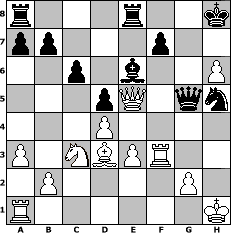 game notation in PGN-format [Event "2er Mannschaftsturnier"] [Site "www.myChess.de"] [Date "2006.11.10"] [Round "1"] [Board "2"] [White "MikeChess"] [Black "kischok69"] [ECO "A13"] [WhitemyELO "1599"] [BlackmyELO "1499"] [Result "1/2-1/2"] [TimeControl "10/1728000"] [WhiteDays "59"] [BlackDays "42"] [MyChessNo "29888"] 1. c4 e6 2. Nc3 d5 3. cxd5 exd5 4. d4 Nf6 5. Bg5 Be7 6. e3 c6 7. Qc2 Nbd7 8. Bd3 h6 9. Bh4 O-O 10. Nf3 Re8 11. O-O Nb6 12. a3 Bd6 13. h3 g5 14. Bg3 Bxg3 15. fxg3 g4 16. Ne5 gxh3 17. Qf2 h2+ 18. Kh1 Kg7 19. Qf4 Be6 20. g4 Nbd7 21. g5 Nh5 22. gxh6+ Kh8 23. Qxh2 Qg5 24. Rf3 Nxe5 25. Qxe5+ 1/2-1/2 position notation in FEN-format r3r2k/pp3p2/2p1b2P/3pQ1qn/3P4/P1NBPR2/1P4P1/R6K - - - 0 25 Captured white pieces: Captured black pieces: Click on a captured piece in order to display the desired move!