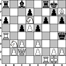 game notation in PGN-format [Event "Auf`s Neue Jahr 2018"] [Site "www.myChess.de"] [Date "2018.01.06"] [Round "1"] [White "Ziegert"] [Black "MiFie"] [ECO "C70"] [WhitemyELO "1590"] [BlackmyELO "1075"] [Result "1-0"] [TimeControl "10/2592000"] [WhiteDays "37"] [BlackDays "86"] [MyChessNo "110934"] 1. e4 e5 2. Nf3 Nc6 3. Bb5 a6 4. Ba4 Bc5 5. O-O Nf6 6. c3 Nxe4 7. d4 Bd6 8. Bc2 O-O 9. Bxe4 h6 10. Be3 Qf6 11. d5 Na5 12. Nbd2 c6 13. Nb3 Nc4 14. Qc2 Nxe3 15. fxe3 b5 16. a4 bxa4 17. Rxa4 c5 18. Nfd2 Qe7 19. Nc4 Qh4 20. Nxd6 f6 21. Bh7+ 1-0 position notation in FEN-format r1b2rk1/3p2pB/p2N1p1p/2pPp3/R6q/1NP1P3/1PQ1P1PP/5RK1 - - - 1 21 Captured white pieces: Captured black pieces: Click on a captured piece in order to display the desired move!