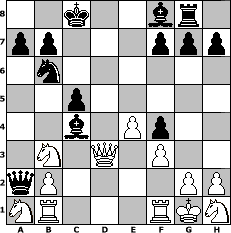 game notation in PGN-format [Event " Chess960 im Sommer, Herbst und Winter"] [Site "www.myChess.de"] [Date "2010.08.04"] [Round "1"] [White "Robert"] [Black "pepo47"] [Variant "Fischerrandom"] [SetUp "1"] [FEN "nrbkqbrn/pppppppp/8/8/8/8/PPPPPPPP/NRBKQBRN w KQkq - 0 1"] [WhitemyELO "1595"] [BlackmyELO "1524"] [Result "0-1"] [TimeControl "10/3456000"] [WhiteDays "16"] [BlackDays "79"] [MyChessNo "67400"] 1. Nb3 d6 2. d4 Qa4 3. e4 e5 4. dxe5 dxe5 5. Be3 Bg4+ 6. f3 O-O-O+ 7. Bd3 Be6 8. Qe2 Ng6 9. O-O Nf4 10. Bxf4 exf4 11. Nd2 Nb6 12. Ndb3 c5 13. c4 Qxa2 14. Qc2 Rxd3 15. Qxd3 Bxc4 0-1 position notation in FEN-format 2k2br1/pp3ppp/1n6/2p5/2b1Pp2/1N1Q1P2/qP4PP/NR3RKN - - - 0 16 Captured white pieces: Captured black pieces: Click on a captured piece in order to display the desired move!