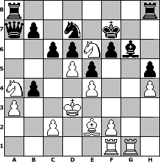 game notation in PGN-format [Event "33 1/3"] [Site "www.myChess.de"] [Date "2009.06.02"] [Round "1"] [White "carlo"] [Black "murphy12"] [ECO "C25"] [WhitemyELO "1619"] [BlackmyELO "1632"] [Result "0-1"] [TimeControl "10/864000"] [WhiteDays "10"] [BlackDays "10"] [MyChessNo "56257"] 1. e4 e5 2. Nc3 c6 3. Nf3 Qe7 4. d4 d6 5. d5 Bg4 6. h3 Bh5 7. g4 Bg6 8. Bg5 Qc7 9. Be2 Nf6 10. Bxf6 gxf6 11. Qd2 h5 12. g5 fxg5 13. Nxg5 Bh6 14. h4 f6 15. Ne6 Bxd2+ 16. Kxd2 Qa5 17. Rhg1 Kf7 18. a3 Nd7 19. b4 Qb6 20. Raf1 a5 21. Na4 Qa7 22. Kd3 axb4 0-1 position notation in FEN-format r6r/qp1n1k2/2ppNpb1/3Pp2p/Np2P2P/P2K4/2P1BP2/5RR1 - - - 0 23 Captured white pieces: Captured black pieces: Click on a captured piece in order to display the desired move!