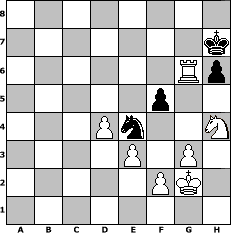 game notation in PGN-format [Event "Unter 1501"] [Site "www.myChess.de"] [Date "2020.08.24"] [Round "2"] [White "Seneca"] [Black "gunni50"] [ECO "A45"] [WhitemyELO "1454"] [BlackmyELO "1241"] [Result "1-0"] [TimeControl "10/2592000"] [WhiteDays "105"] [BlackDays "082"] [MyChessNo "119144"] 1. d4 Nf6 2. e3 d5 3. Nf3 Nc6 4. Be2 e6 5. O-O Bd6 6. c4 dxc4 7. Bxc4 O-O 8. a3 a6 9. b4 b5 10. Bd3 Bb7 11. Nbd2 Ng4 12. Qc2 Nxh2 13. Nxh2 Bxh2+ 14. Kxh2 Qh4+ 15. Kg1 Ne7 16. Be4 Bxe4 17. Qxe4 Qh6 18. Nf3 f5 19. Qh4 Qxh4 20. Nxh4 a5 21. Bd2 axb4 22. Bxb4 Rfe8 23. Rac1 Ra7 24. Nf3 Nd5 25. Rc5 Nxb4 26. Rxb5 Nc2 27. Rc5 Nxa3 28. Rfc1 Rb7 29. Rxc7 Rxc7 30. Rxc7 h6 31. g3 Nb5 32. Rd7 Rf8 33. Re7 Nc3 34. Rxe6 Kh7 35. Kg2 Rf6 36. Rxf6 g6 37. Nh4 Ne4 38. Rxg6 1-0 position notation in FEN-format 8/7k/6Rp/5p2/3Pn2N/4P1P1/5PK1/8 - - - 0 38 Captured white pieces: Captured black pieces: Click on a captured piece in order to display the desired move!