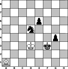 game notation in PGN-format [Event "Chess960 Open II 2014"] [Site "www.myChess.de"] [Date "2014.04.14"] [Round "1"] [White "Erich"] [Black "Cuibono"] [Variant "Fischerrandom"] [SetUp "1"] [FEN "qrnbnkbr/pppppppp/8/8/8/8/PPPPPPPP/QRNBNKBR w KQkq - 0 1"] [WhitemyELO "2049"] [BlackmyELO "1941"] [Result "0-1"] [TimeControl "10/3456000"] [WhiteDays "40"] [BlackDays "40"] [MyChessNo "93927"] 1. e4 h6 2. f3 e6 3. Be3 Bh7 4. d4 Nf6 5. Ned3 d5 6. e5 Nd7 7. O-O O-O 8. Ne2 Ne7 9. Ng3 a5 10. f4 Qa7 11. Be2 c6 12. a3 a4 13. Rfd1 Bb6 14. b4 axb3 15. Rxb3 Bc7 16. Bf2 b5 17. a4 Ra8 18. Ra3 Nb6 19. a5 Nc4 20. Ra2 Nxa5 21. Qc3 Bb6 22. Rda1 Rfb8 23. Qb4 Qc7 24. Qd6 Rb7 25. Nc5 Nc8 26. Qxc7 Rxc7 27. Be1 Rca7 28. Bb4 Nc4 29. Rxa7 Rxa7 30. Rxa7 Bxa7 31. c3 Bxc5 32. Bxc5 N8b6 33. Bxc4 Nxc4 34. Ne2 Bb1 35. Nc1 Kh7 36. Nb3 Kg6 37. Bf8 h5 38. Kf2 Be4 39. g3 Kf5 40. h3 Nb2 41. Na5 Nd1+ 42. Ke1 Nxc3 43. Kd2 Na4 44. Nxc6 Bg2 45. g4+ hxg4 46. hxg4+ Kxg4 47. Ke3 g6 48. Nd8 Be4 49. Nxf7 Nb2 50. Nd6 b4 51. Nxe4 dxe4 52. Kxe4 b3 53. Bh6 Nc4 54. Kd3 Ne3 55. Kc3 Nf5 56. Bg5 Nxd4 57. Kb2 Kf5 58. Bh6 Ne2 59. Kxb3 Nxf4 60. Kc3 Kxe5 61. Kd2 Ke4 62. Bg5 Kf3 63. Bf6 Nd5 64. Ba1 g5 65. Kd3 g4 0-1 position notation in FEN-format 8/8/4p3/3n4/6p1/3K1k2/8/B7 - - - 0 66 Captured white pieces: Captured black pieces: Click on a captured piece in order to display the desired move!