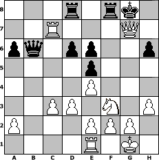 game notation in PGN-format [Event "Februar 2017"] [Site "www.myChess.de"] [Date "2017.02.05"] [Round "1"] [White "Joschi"] [Black "MiFie"] [ECO "C70"] [WhitemyELO "1577"] [BlackmyELO "1052"] [Result "1-0"] [TimeControl "10/1728000"] [WhiteDays "60"] [BlackDays "50"] [MyChessNo "106807"] 1. e4 e5 2. Nf3 Nc6 3. Bb5 a6 4. Ba4 Bc5 5. O-O Nf6 6. d3 b5 7. Bb3 O-O 8. h3 h6 9. Re1 d6 10. Be3 Bb4 11. c3 Ba5 12. Nbd2 b4 13. Rc1 Rb8 14. Nc4 bxc3 15. bxc3 Be6 16. Nxa5 Nxa5 17. Bxe6 fxe6 18. Qa4 c6 19. Rb1 Ra8 20. Bb6 Qb8 21. Bxa5 Qc8 22. Rb6 Nd7 23. Rxc6 Qb7 24. Rc7 Nb6 25. Bxb6 Qxb6 26. Qd7 Rad8 27. Qxg7# 1-0 position notation in FEN-format 3r1rk1/2R3Q1/pq1pp2p/4p3/4P3/2PP1N1P/P3PPP1/4R1K1 - - - 0 27 Captured white pieces: Captured black pieces: Click on a captured piece in order to display the desired move!