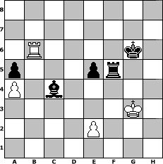 game notation in PGN-format [Event "Unter 1501"] [Site "www.myChess.de"] [Date "2020.08.24"] [Round "1"] [White "wolni55"] [Black "gunni50"] [ECO "C50"] [WhitemyELO "1416"] [BlackmyELO "1241"] [Result "1/2-1/2"] [TimeControl "10/2592000"] [WhiteDays "142"] [BlackDays "107"] [MyChessNo "119081"] 1. e4 e5 2. Nf3 Nc6 3. Bc4 Qf6 4. h3 Bc5 5. d3 Nge7 6. c3 O-O 7. Bg5 Qd6 8. a4 b6 9. b4 Bxf2+ 10. Kxf2 Ng6 11. Re1 a6 12. Kf1 a5 13. b5 h6 14. bxc6 hxg5 15. cxd7 Bxd7 16. Nxg5 Qf6+ 17. Kg1 Qxg5 18. Qf3 Rae8 19. Nd2 Be6 20. Bb5 Rc8 21. Bc6 Qxd2 22. c4 Nf4 23. Qe3 Nxh3+ 24. gxh3 Qxe3+ 25. Rxe3 Rb8 26. Kh2 g6 27. Rg1 Kg7 28. h4 f5 29. Reg3 Rf6 30. h5 Rh8 31. Rxg6+ Rxg6 32. Rxg6+ Kf7 33. Rg5 Kf6 34. Rg6+ Kf7 35. exf5 Rxh5+ 36. Kg3 Bxf5 37. Be8+ Kxe8 38. Rg8+ Kf7 39. Ra8 Bxd3 40. Ra7 Rf5 41. Rxc7+ Kg6 42. Rc6+ Kg5 43. Rxb6 Bxc4 44. Rb7 Kg6 45. Rb6+ Kg5 46. Rb7 Kg6 47. Rb6+ 1/2-1/2 position notation in FEN-format 8/8/1R4k1/p3pr2/P1b5/6K1/4P3/8 - - - 7 47 Captured white pieces: Captured black pieces: Click on a captured piece in order to display the desired move!