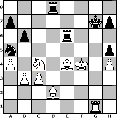 game notation in PGN-format [Event "Alte Kameraden :-))"] [Site "www.myChess.de"] [Date "2013.05.29"] [Round "1"] [White "PeterLoskarn"] [Black "Cuibono"] [ECO "C25"] [WhitemyELO "2132"] [BlackmyELO "1808"] [Result "1-0"] [TimeControl "10/2592000"] [WhiteDays "077"] [BlackDays "107"] [MyChessNo "88498"] 1. e4 e5 2. Nc3 Nc6 3. g3 Bc5 4. Bg2 d6 5. Nge2 f5 6. O-O Nf6 7. d3 f4 8. gxf4 Ng4 9. h3 Bxf2+ 10. Rxf2 Nxf2 11. Kxf2 Qh4+ 12. Ng3 O-O 13. Qh5 Qxh5 14. Nxh5 g6 15. Nd5 gxh5 16. Nxc7 Rb8 17. f5 Nb4 18. Bh6 Rf7 19. Nb5 Bd7 20. Na3 Kh8 21. Bf3 Rg8 22. h4 Bxf5 23. exf5 Rxf5 24. Ke2 d5 25. Bd2 Nc6 26. c3 e4 27. dxe4 dxe4 28. Bxe4 Re8 29. Kd3 Rf2 30. Nc4 Rd8+ 31. Ke3 Rf6 32. a4 Re6 33. Re1 Kg7 34. b3 b6 35. Kf4 Na5 36. Rg1+ 1-0 position notation in FEN-format 3r4/p5kp/1p2r3/n6p/P1N1BK1P/1PP5/3B4/6R1 - - - 3 36 Captured white pieces: Captured black pieces: Click on a captured piece in order to display the desired move!
