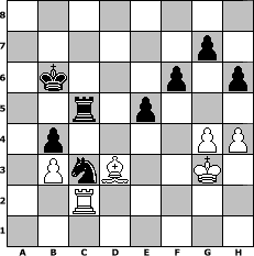 game notation in PGN-format [Event "Entdeckung der Langsamkeit III"] [Site "www.myChess.de"] [Date "2013.03.15"] [Round "1"] [White "Schachboy1"] [Black "FrankB"] [ECO "A13"] [WhitemyELO "1598"] [BlackmyELO "1577"] [Result "0-1"] [TimeControl "10/3456000"] [WhiteDays "140"] [BlackDays "156"] [MyChessNo "87094"] 1. c4 e6 2. d4 d5 3. Nc3 Nf6 4. Nf3 b6 5. e3 Bb7 6. Be2 Nbd7 7. O-O Be7 8. cxd5 Nxd5 9. Nxd5 Bxd5 10. Qc2 c5 11. e4 Bb7 12. Bb5 O-O 13. Rd1 Rc8 14. Bc4 cxd4 15. Rxd4 Qc7 16. Nd2 b5 17. Bb3 Qxc2 18. Bxc2 Nf6 19. Bd1 Rfd8 20. Rxd8+ Rxd8 21. Be2 Bxe4 22. Nxe4 Nxe4 23. Be3 a6 24. a4 Rb8 25. axb5 axb5 26. Rb1 b4 27. Rc1 Bf6 28. b3 Bc3 29. Rd1 Kf8 30. f3 Nf6 31. f4 Nd5 32. Kf2 Ra8 33. Bc5+ Ke8 34. g3 Ra2 35. Kf3 Ra5 36. Bd6 Kd7 37. Be5 Kc6 38. Rc1 Kb6 39. h4 Bxe5 40. fxe5 Nc3 41. Rc2 Rxe5 42. Bc4 f6 43. Bd3 Rc5 44. g4 h6 45. Kg3 e5 0-1 position notation in FEN-format 8/6p1/1k3p1p/2r1p3/1p4PP/1PnB2K1/2R5/8 - - - 0 46 Captured white pieces: Captured black pieces: Click on a captured piece in order to display the desired move!
