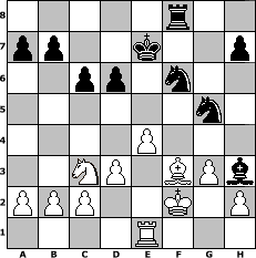 game notation in PGN-format [Event "Neue Reihe: sch"] [Site "www.myChess.de"] [Date "2009.11.16"] [Round "2"] [White "espero"] [Black "HenrySchinasky"] [ECO "C25"] [WhitemyELO "1693"] [BlackmyELO "2120"] [Result "0-1"] [TimeControl "10/2592000"] [WhiteDays "30"] [BlackDays "30"] [MyChessNo "60760"] 1. e4 e5 2. Nc3 Nc6 3. f4 exf4 4. Nf3 g5 5. Bc4 g4 6. O-O gxf3 7. Qxf3 Qh4 8. g3 Bc5+ 9. Kg2 Qh6 10. Nd5 Ne5 11. Qxf4 Qxf4 12. Rxf4 Kd8 13. Be2 c6 14. Nc3 d6 15. Na4 Ng6 16. Rxf7 Bd4 17. d3 Bf6 18. Bh5 Ne5 19. Rxf6 Nxf6 20. Bg5 Ned7 21. Rf1 Rf8 22. Bh6 Ke7 23. Bxf8+ Nxf8 24. Bf3 Ne6 25. Nc3 Ng5 26. Re1 Bh3+ 27. Kf2 Rf8 0-1 position notation in FEN-format 5r2/pp2k2p/2pp1n2/6n1/4P3/2NP1BPb/PPP2K1P/4R3 - - - 8 28 Captured white pieces: ![]() ![]() ![]() ![]() ![]() ![]() ![]() ![]() ![]() ![]() ![]() ![]() ![]() ![]() ![]() Captured black pieces: ![]() ![]() ![]() ![]() ![]() ![]() ![]() ![]() ![]() ![]() ![]() ![]() ![]() ![]() ![]() Click on a captured piece in order to display the desired move!